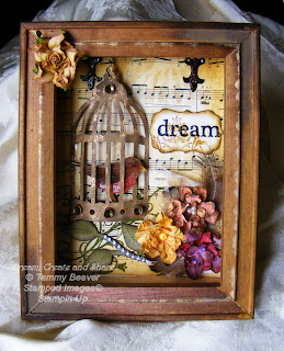 I colored the box with some vintage photo and walnut stain distress inks. I then took a gold dauber and added some highlight to the edges. I wanted to be sure the frame had lots of depth. The very back of the inside of the box is covered with a piece of vintage sheet music that the edges have been distressed. I then stamped a flourish in Peeled Paint distress ink in the lower left corner.